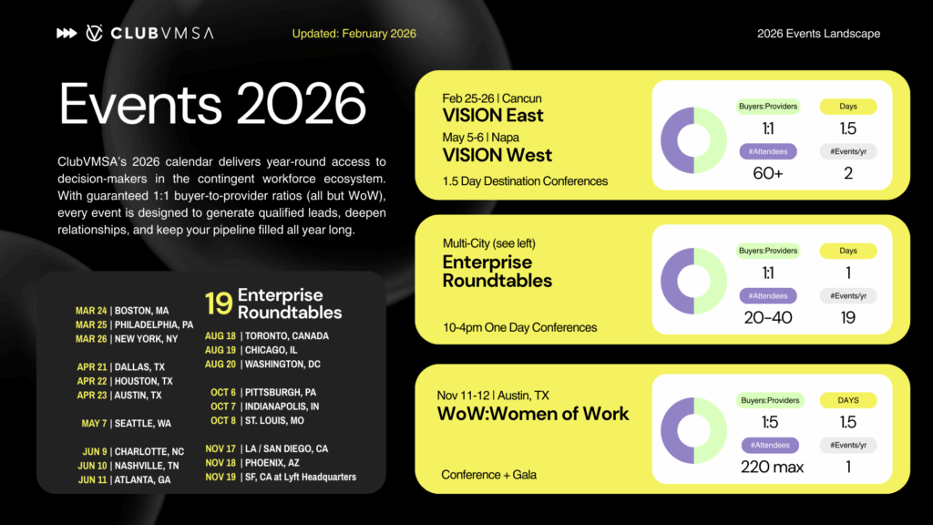 ClubVMSA convenes the most intentional buyer-provider rooms in the extended workforce market.